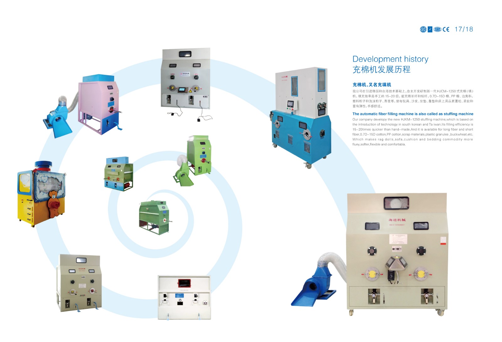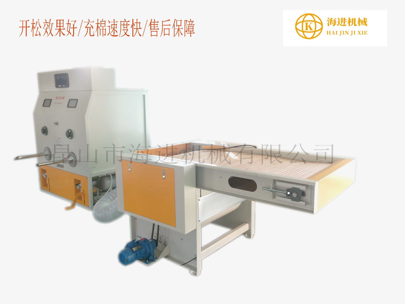 自主開(kāi)發(fā)研制新一代HJCM-1250(1200)式充棉(填)機(jī),填充效率是手工的15-20倍,能充填長(zhǎng)纖和短纖,0.7D- 15D棉、PP棉、碎海綿、邊角料、塑料粒子和泡沫粒子、喬麥等,使布玩具、沙發(fā)、坐墊、靠墊、寵物墊和床上用品更蓬松、柔軟和富有彈性,手感舒適。 產(chǎn)品名稱(chēng):化纖開(kāi)松充棉一體機(jī)(開(kāi)松+充填流水線(xiàn))